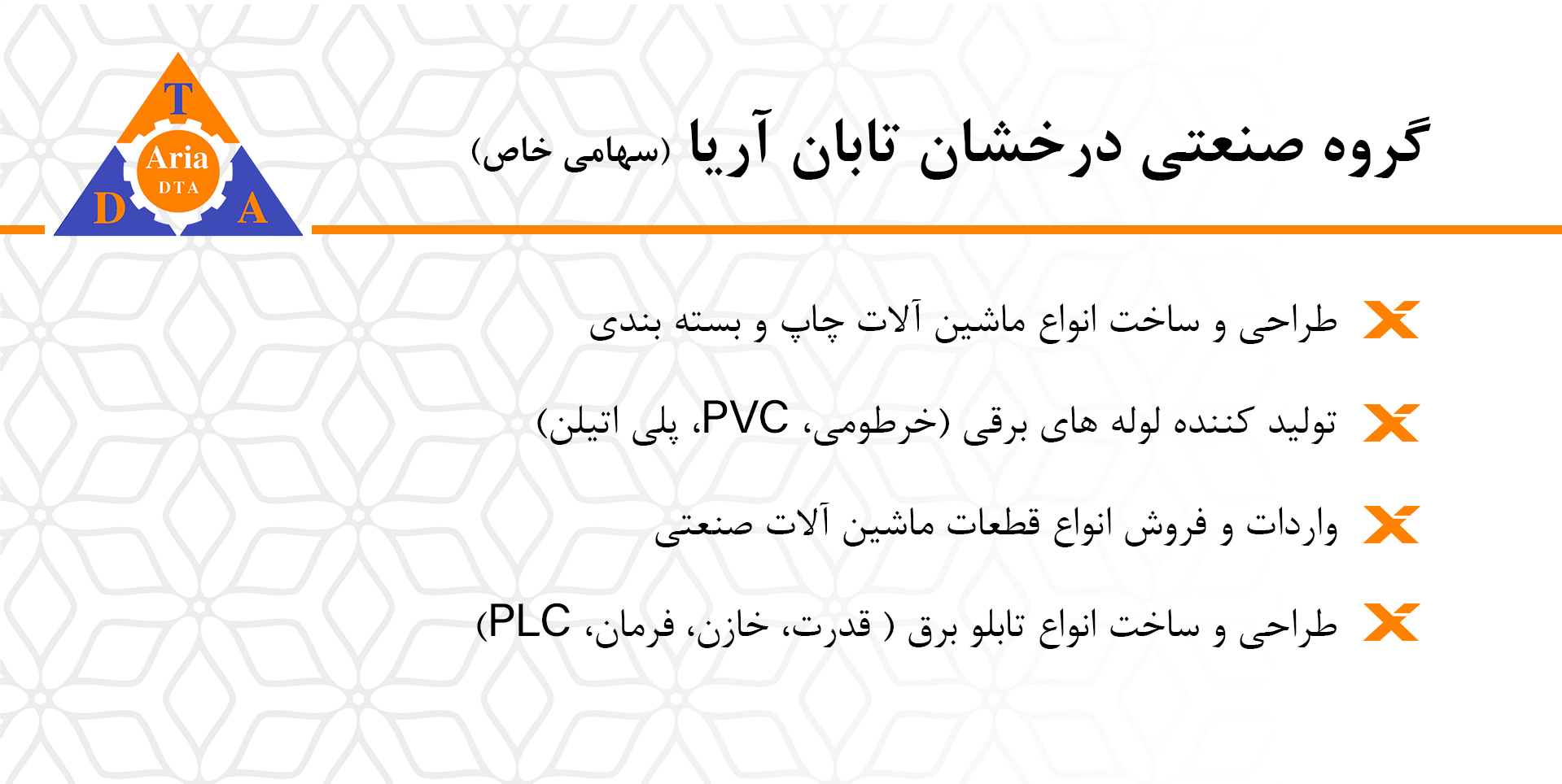 شرکت دانش بنیان درخشان تابان آریا پیشرو در طراحی و ساخت ماشینآلات بستهبندی، انواع وکیوم کانوایر با قدرتهای مختلف، انواع قطعات ماشینآلات، انواع تابلو برق صنعتی قدرت و مدار فرمان همراه با PLC هستیم. همچنین یکی دیگر از فعالیتهای ما طراحی و اجرای اتوماسیون خط تولید در کارخانجات صنعتی میباشد. تولید و توزیع لوله و خرطومی پلیاتیلن برقی یکی دیگر از فعالیتهای شرکت محسوب میشود.